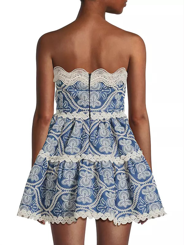De la colección Time. El minivestido Adaline de Waimari presenta un escote palabra de honor y una silueta acampanada. Adornado con ribetes de encaje, está confeccionado en algodón y luce un intrincado bordado.