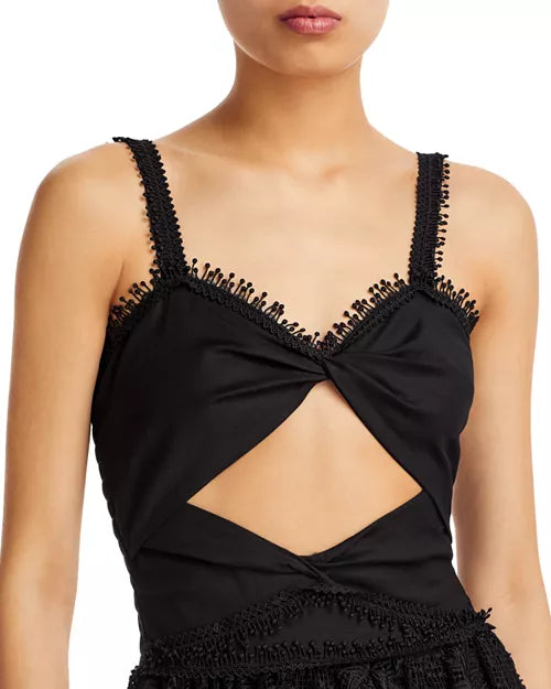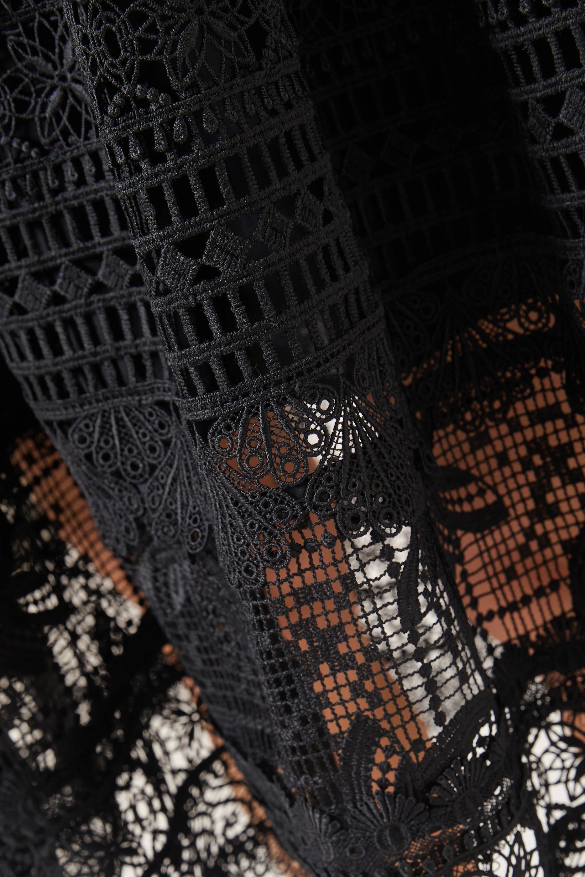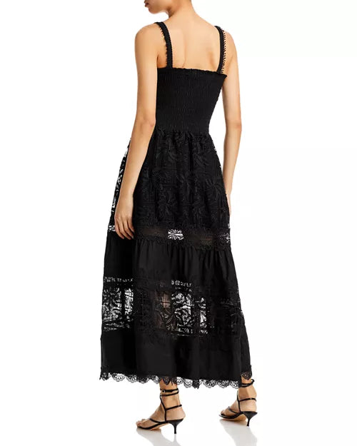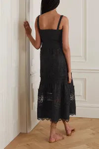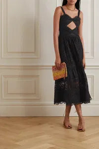 Este vestido midi «Emma» está confeccionado con encaje de guipur y popelina, con un panel transparente en el corpiño, que se abre paso hasta convertirse en una falda amplia con capas. Un dobladillo festoneado le da el toque final.