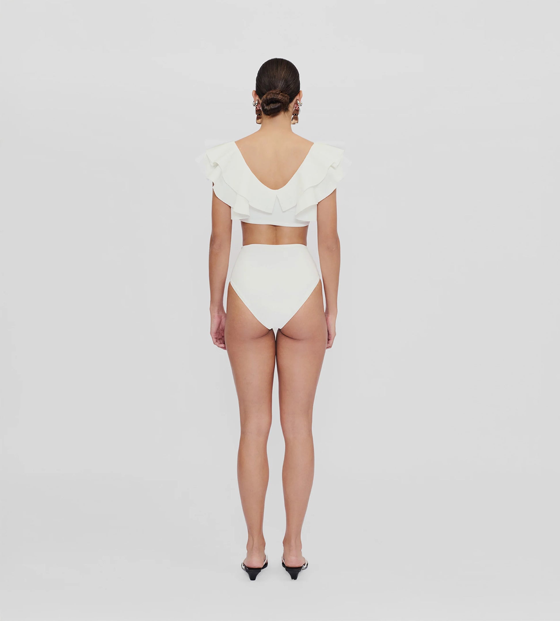 Traje de baño de dos piezas con talle alto. Parte superior con cuello triangular profundo adelante y atrás con doble arandelas desde el escote hasta la espalda cubriendo los hombros.