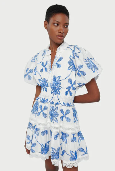 Minivestido de broderie anglaise ribeteado en algodón con mangas midi y cintura fruncida para una silueta ajustada y delicados volantes.