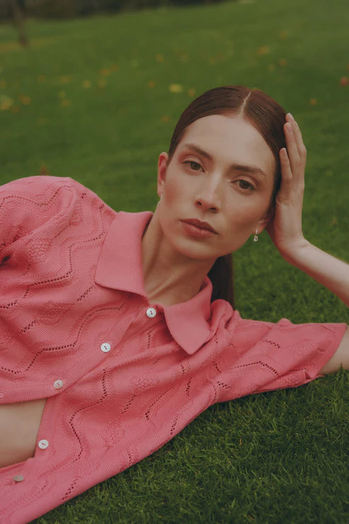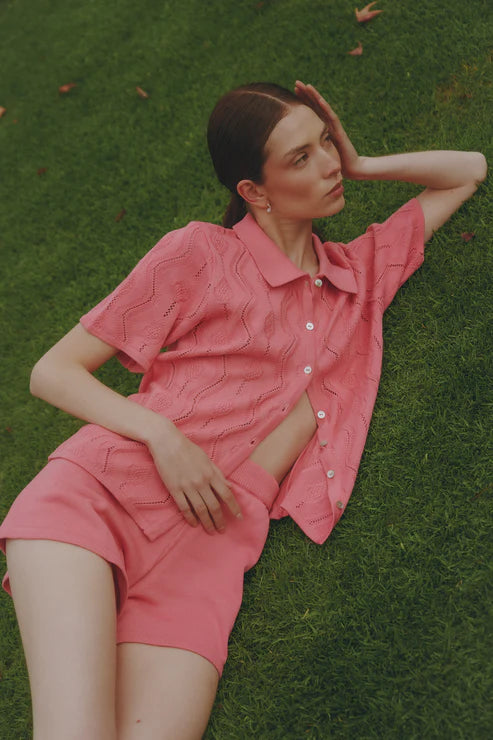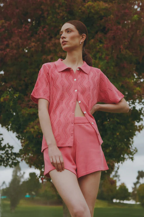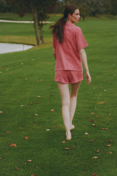 Camisa tejida con cuello y botones. Short mini, talle medio alto con pretina en caucho.