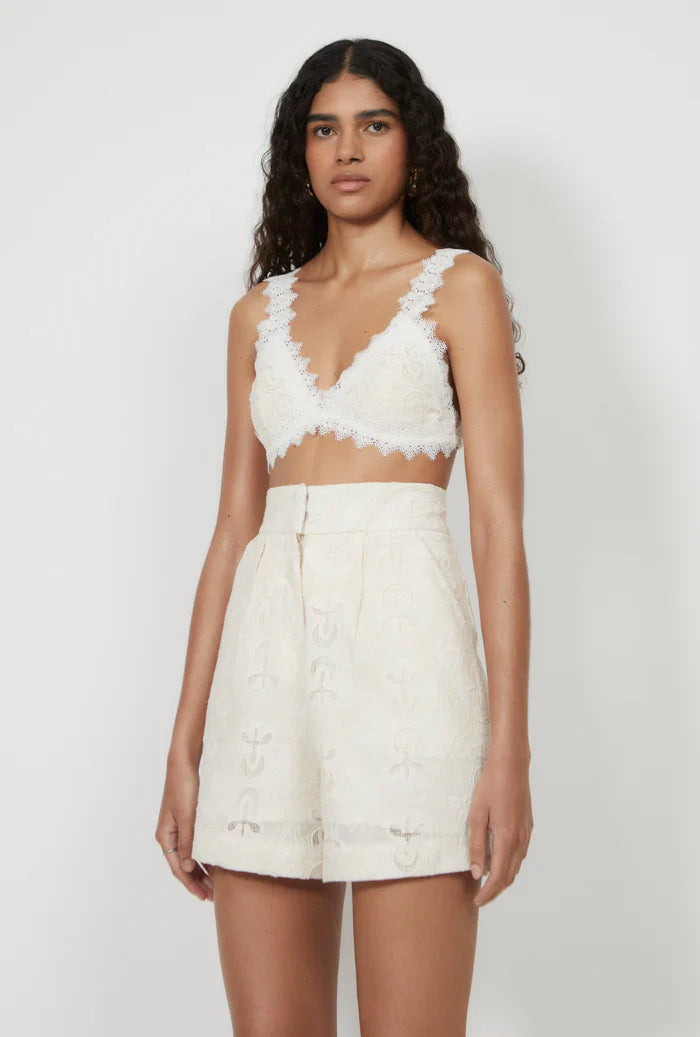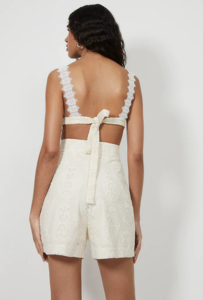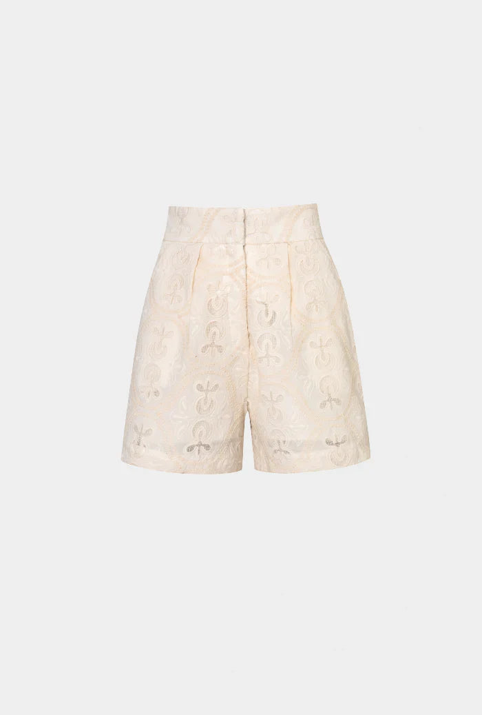 Las Bermudas Bonaire tienen un estilo sastre clásico, con bragueta en la parte delantera y cinturilla clásica abrochada con dos botones forrados. Presentan prácticos bolsillos laterales cortados, pinzas traseras y pliegues delanteros que mejoran la forma y la estructura. Con una silueta relajada, están adornados con un delicado ribete de encaje en el dobladillo. Confeccionado en un tejido de algodón intrincadamente bordado.