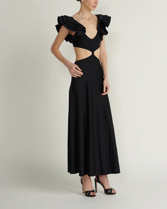 Vestido ajustado con escote cuadrado, tirantes finos y tres volantes en forma de flor. Incluye ropa interior de talle alto que estiliza la figura.
