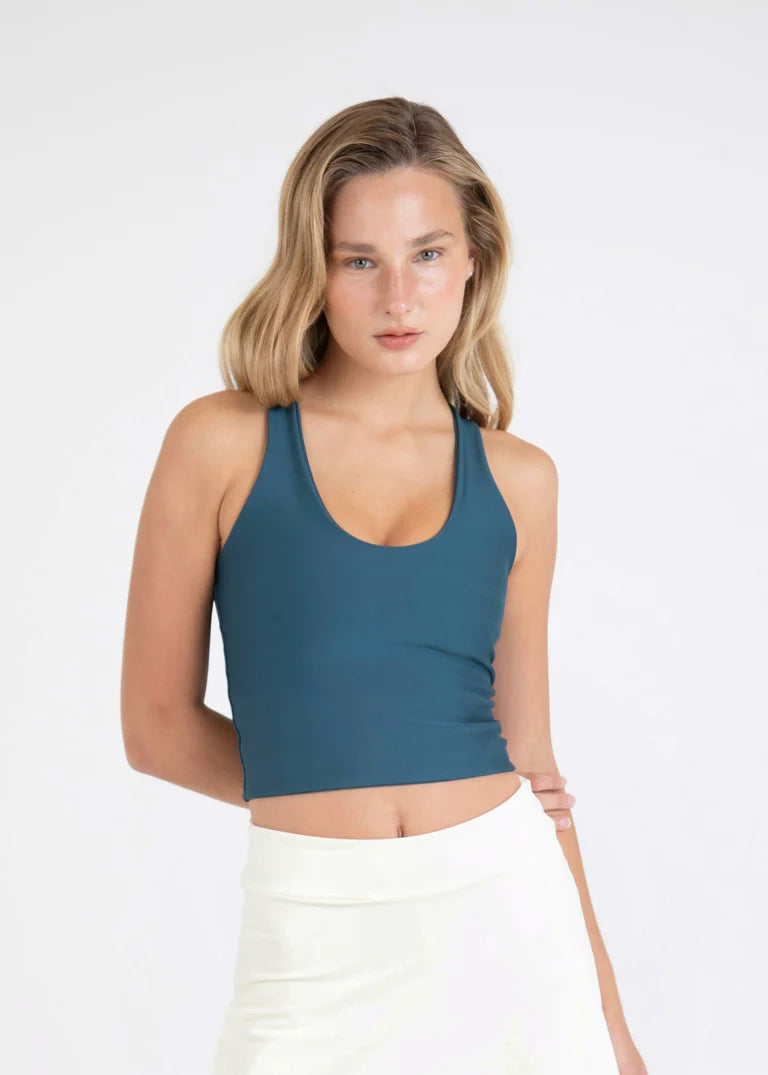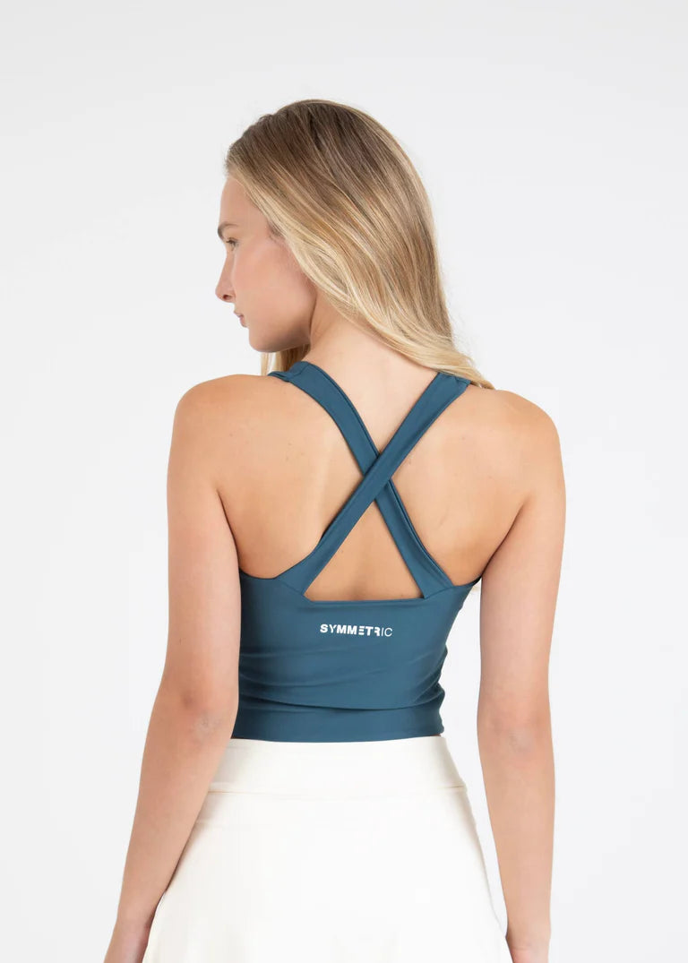 Top perfecto para todo tipo de ejercicio. Tiene un diseño clásico adelante con un leve escote, tiras que cruzan en la espalda y doble forro hasta la cintura brindando excelente cobertura y estilo.