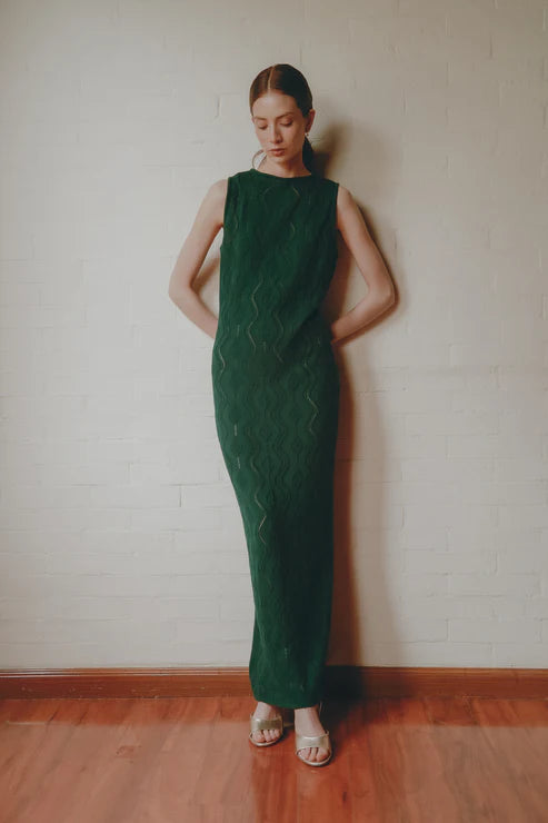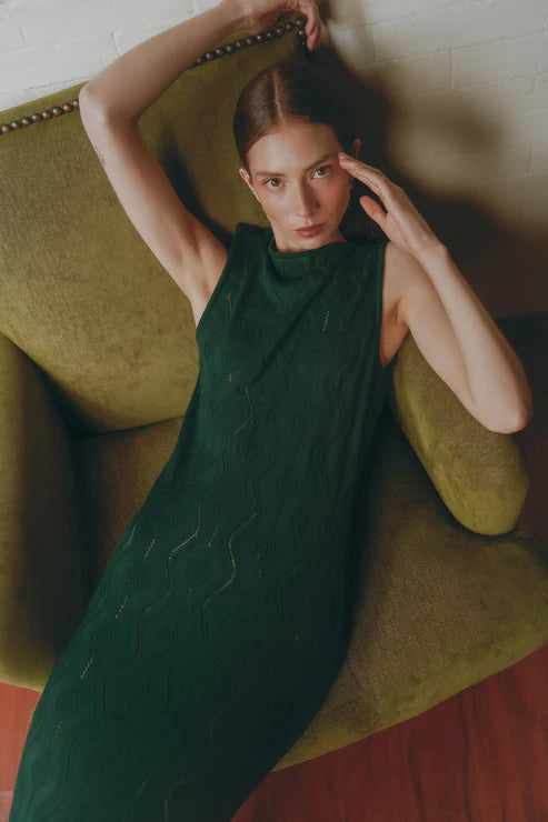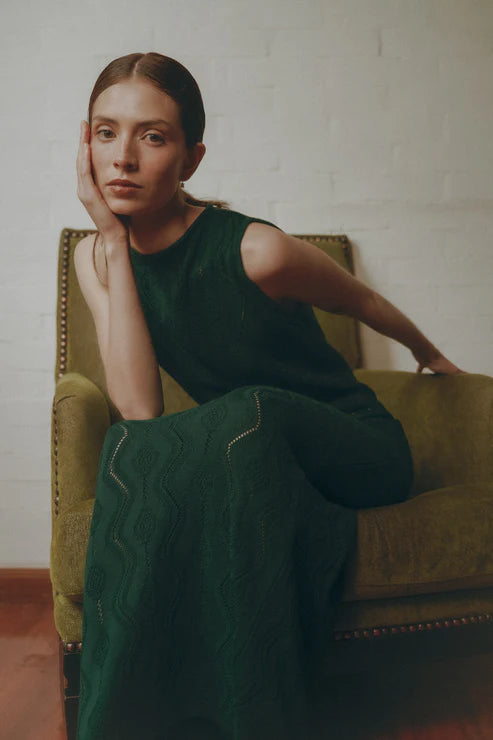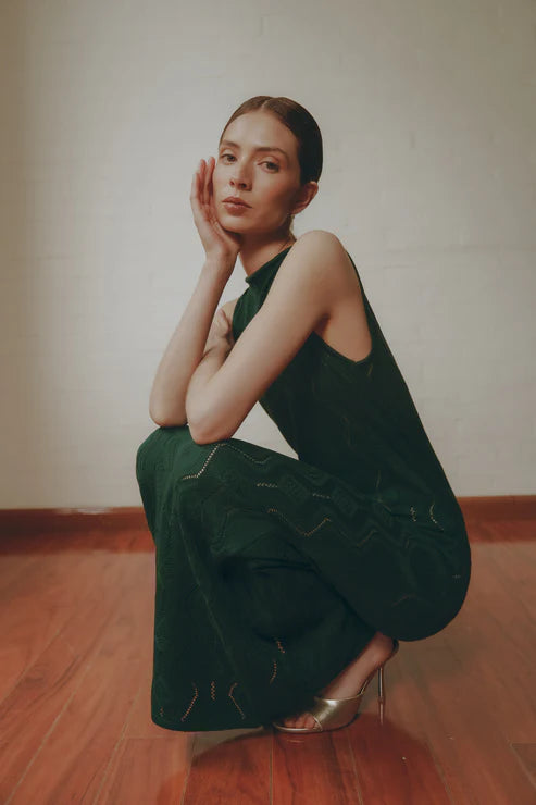 "Creciente", en un profundo verde. Esta prenda está pensada para momentos de tranquilidad y contemplación. Su diseño sencillo pero elegante proporciona una sensación de paz y armonía, permitiendo que te sientas cómoda mientras sigues tu propio camino.
