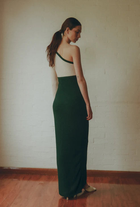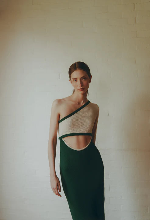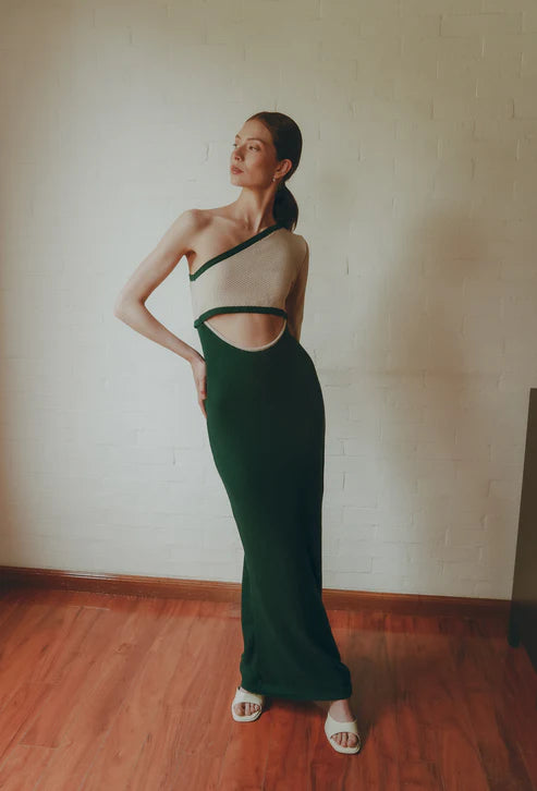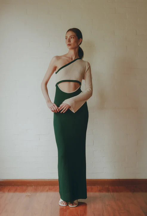 Vestido largo, una manga campana, silueta al cuerpo y cut-out en la parte frontal.