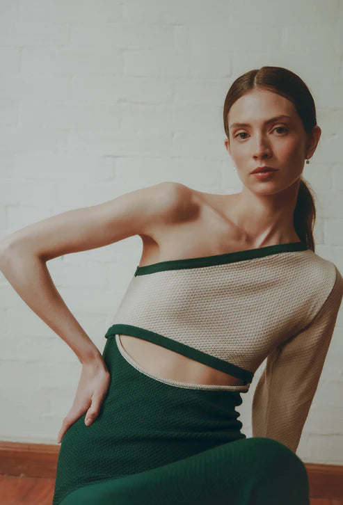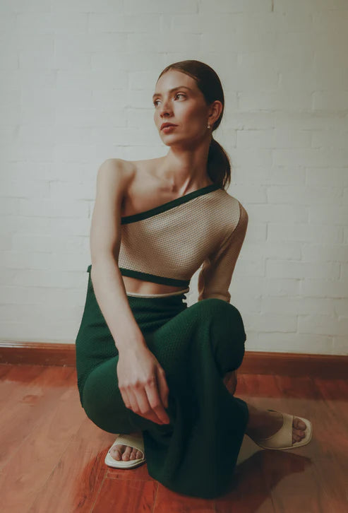 Sendero Serene, la mezcla perfecta entre el tono ivory y verde. En un diseño que simboliza el crecimiento y la evolución constante. Con un corte moderno y detalles que evocan la expansión y la transformación, esta prenda es perfecta para la mujer en constante desarrollo y florecimiento.